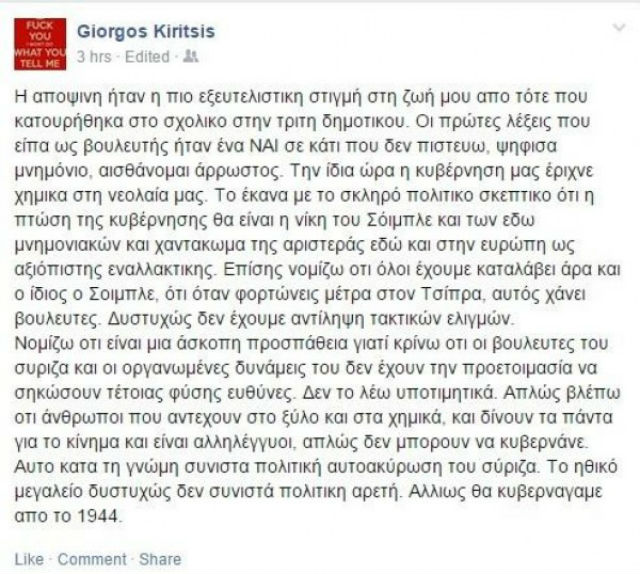 Ο κ. Κυρίτσης, υποστήριξε τον ΣΥΡΙΖΑ όμως πήρε μια απόφαση για την οποία ντρέπεται, σύμφωνα με τα όσα έγραψε ο ίδιος στον προσωπικό του λογαριασμό στο facebook.