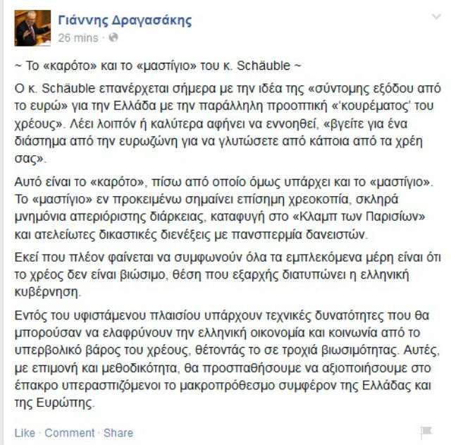 Την αλήθεια πίσω από την πρόταση Σόιμπλε για προσωρινή έξοδο της Ελλάδας από το ευρώ, προσπαθεί να αναδείξει με ανάρτησή του στο facebook ο αντιπρόεδρος της κυβέρνησης Γιάννης Δραγασάκης.
