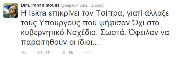 Ο Δημήτρης Παπαδημούλης αναφέρεται σε κείμενο της ιστοσελίδας iskra που τιτλοφορείται «Ανασχηματισμός χωρίς… πλατφόρμα» και σημειώνει πως ο ανασχηματισμός ήταν μια κίνηση της κυβέρνησης που ως μοναδικό της στόχο είχε να διώξει τους Λαφαζάνη, Στρατούλη και Ήσυχο.