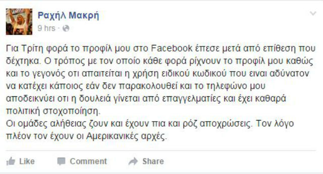 Για Τρίτη φορά το προφίλ μου στο Facebook έπεσε μετά από επίθεση που δέχτηκα. Ο τρόπος με τον οποίο κάθε φορά ρίχνουν το προφίλ μου καθώς και το γεγονός οτι απαιτείται η χρήση ειδικού κωδικού που ειναι αδύνατον να κατέχει κάποιος εάν δεν παρακολουθεί και το τηλεφώνο μου αποδεικνύει οτι η δουλειά γίνεται από επαγγελματίες και έχει καθαρά πολιτική στοχοποίηση.