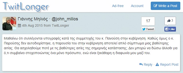 Η πλήρης ανάρτηση του Γιάννη Μηλιού αναφέρει: