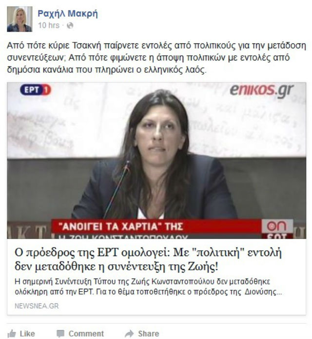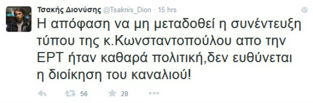 Ο λογαριασμός με το όνομα Διονύσης Τσακής έγραψε στο Twitter πως η απόφαση να μη μεταδοθεί η συνέντευξη τύπου της Ζωής Κωνσταντοπούλου από την ΕΡΤ ήταν καθαρά πολιτική και πως δεν ευθύνεται η διοίκηση του καναλιού, προφανώς η κ. Μακρή διάβασε βιαστικά και δεν είδε πως δεν πρόκειται για τον κ. Τσακνή αλλά για έναν ψεύτικο λογαριασμό με το όνομα Τσακής Διονύσης.
