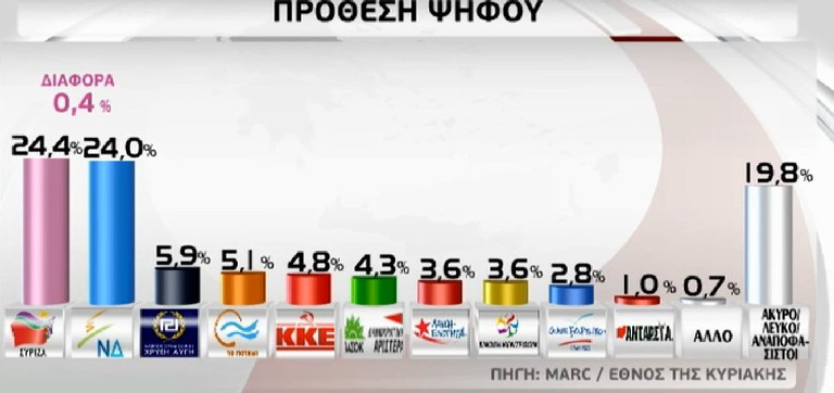 Μάχη στήθος με στήθος δείχνουν οι δημοσκόποι, με τη διαφορά ΣΥΡΙΖΑ και Νέας Δημοκρατίας να είναι μόλις στο 0,4%.
