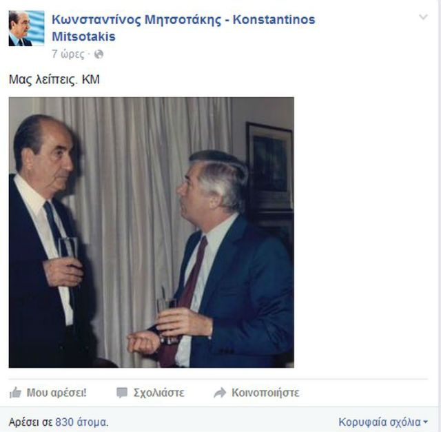 Σε ανάρτησή του στο Facebook, ο επίτιμος πρόεδρος της Νέας Δημοκρατίας, έγραψε «Μου λείπεις.ΚΜ», συνοδεύοντας τις λέξεις, με μια φωτογραφία από το παρελθόν, που απεικονίζει τον ίδιο μαζί με τον αείμνηστο πολιτικό.