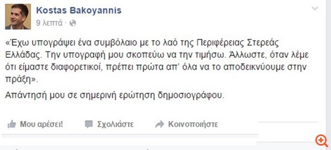 Ο κ. Μπακογιάννης με ανάρτησή του στο Facebook σημειώνει ότι έχει ένα «συμβόλαιο» με το λαό της Στερεάς Ελλάδας, προεξοφλώντας ουσιαστικά ότι θα παραμείνει στην Περιφέρεια να ολοκληρώσει το έργο του.