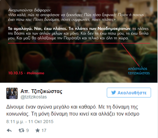 Εν μέσω προεκλογικού αγώνα για την προεδρία της ΝΔ, ο υποψήφιος Απόστολος Τζιτζικώστας έστειλε ένα μήνυμα μέσω του προσωπικού του λογαριασμού στο twitter.