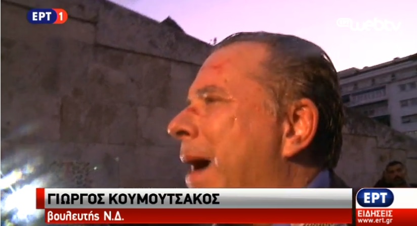 Άγνωστοι που βρίσκονταν μεταξύ των συγκεντρωμένων χτύπησαν τον βουλευτή της Νέας Δημοκρατίας Γιώργο Κουμουτσάκο, έξω από τη Βουλή, κοντά στο Μνημείο του Άγνωστου Στρατιώτη.
