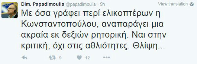 Άμεση ήταν η απάντηση από τον ευρωβουλευτή του ΣΥΡΙΖΑ, Δημήτρη Παπαδημούλη ο οποίος σε έντονο ύφος έγραψε: «Με όσα γράφει περί ελικοπτέρων η Κωνσταντοπούλου, αναπαράγει μια ακραία εκ δεξιών ρητορική. Ναι στην κριτική, όχι στις αθλιότητες. Θλίψη…».