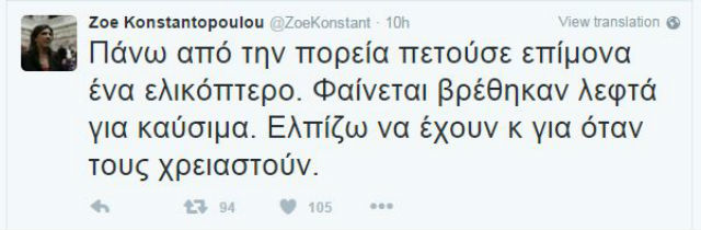 Αφορμή για να ξεσπάσει η κόντρα ήταν ένα αιχμηρό σχόλιο από την Ζωή Κωσταντοπούλου στο twitter, όπου με αφορμή το ελικόπτερο της αστυνομίας που πετούσε χθες πάνω από το κέντρο της Αθήνας, έγραψε: «Πάνω από την πορεία πετούσε επίμονα ένα ελικόπτερο. Φαίνεται βρέθηκαν λεφτά για καύσιμα. Ελπίζω να έχουν και για όταν τους χρειαστούν».