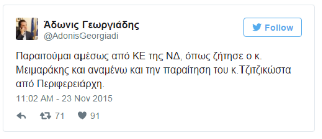 «Παραιτούμαι αμέσως από ΚΕ της ΝΔ, όπως ζήτησε ο κ. Μειμαράκης», έγραψε στον λογαριασμό του στον twitter, συμπληρώνοντας πως αναμένει και την παραίτηση του Απόστολου Τζιτζικώστα από περιφερειάρχη Κεντρικής Μακεδονίας.