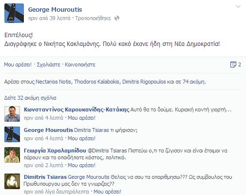 “Επιτέλους! Διαγράφηκε ο Νικήτας Κακλαμάνης. Πολύ κακό έκανε ήδη στη Νέα Δημοκρατία!” έγραψε στον τοίχο του εισπράτοντας αρκετά like.