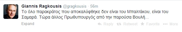 Συγκεκριμένα ο Γιάννης Ραγκούσης έγραψε: “Το όλο παρακράτος που αποκαλύφθηκε δεν είναι του Μπαλτάκου, είναι του Σαμαρά. Τώρα άλλος Πρωθυπουργός από την παρούσα Βουλή…”.