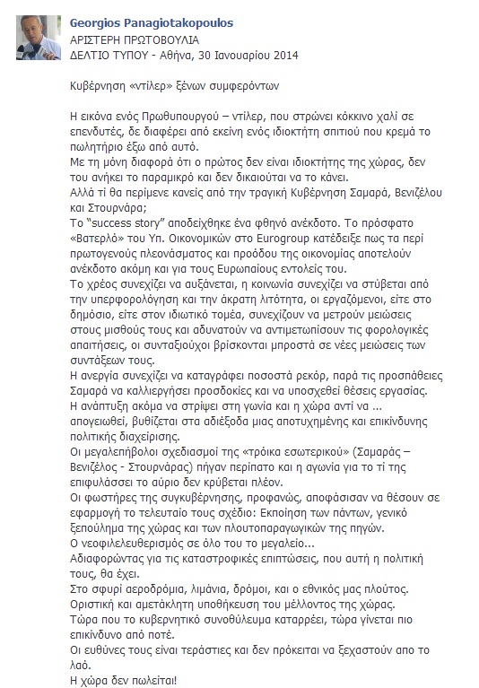 Διαβάστε το πλήρες κείμενο όπως αναρτήθηκε στον προσωπικό λογαριασμό του Γιώργου Παναγιωτακόπουλου στο facebook: