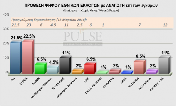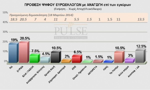 Προβάδισμα 1,5% για τον ΣΥΡΙΖΑ έναντι της Νέας Δημοκρατίας καταγράφει νέα πανελλήνια δημοσκόπηση της Pulse στην πρόθεση ψήφου με αναγωγή στις Ευρωεκλογές για λογαριασμό του τηλεοπτικού σταθμού Action24.