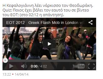 Σήμερα όμως το site protagon σχολίασε “Η Κεφαλογιάννη λέει νάρκισσο τον Θεοδωράκη. Quiz: Ποιος έχει βάλει τον εαυτό του σε βίντεο του ΕΟΤ; (στο 02:12 η απάντηση)” και δίνει το βίντεο από το διαφημιστικό που είχε κάνει ο ΕΟΤ στο Λονδίνο όπου πράγματι στο 2:12 λεπτό εμφανίζεται η υπουργός Τουρισμού.