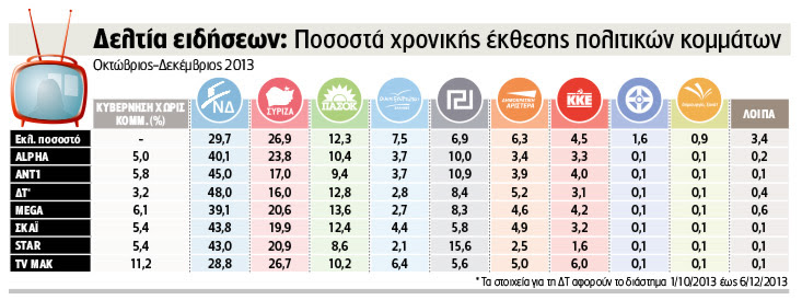 Το φαινόμενο του σχεδόν ολοκληρωτικού αποκλεισμού από τα τηλεοπτικά δελτία που διαρκεί εδώ και πάρα πολύ καιρό, επιβεβαιώνεται από τις σχετικές δημοσιευμένες μετρήσεις με βάση τις οποίες τα δύο κόμματα έχουν λιγότερο από 0,2% μερίδιο τηλεοπτικού χρόνου (ενδεικτική η περίοδος Οκτωβρίου-Δεκεμβρίου 2013).