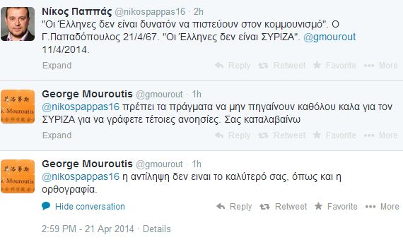 “@nikospappas16 πρέπει τα πράγματα να μην πηγαίνουν καθόλου καλα για τον ΣΥΡΙΖΑ για να γράφετε τέτοιες ανοησίες. Σας καταλαβαίνω. Η αντίληψη δεν ειναι το καλύτερό σας, όπως και η ορθογραφία” απάντησε ο εκπρόσωπος τύπου του Πρωθυπουργού Γιώργος Μουρούτης.