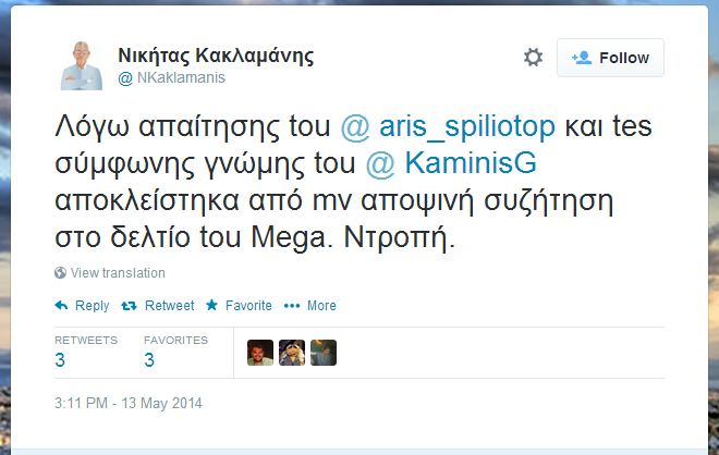“Λόγω απαίτησης Άρη Σπηλιωτόπουλου και της σύμφωνης γνώμης του Γιώργου Καμίνη αποκλείστηκα από την αποψινή συζήτηση στο δελτίο tou Mega. Ντροπή.”
