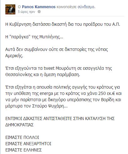 “Αυτό αποτελεί κατάλυση της Δημοκρατίας. Ζητάω άμεσα την παραίτηση του υπουργού Δικαιοσύνης και τη διερεύνηση της υπόθεσης από Ανώτατο Δικαστικό Συμβούλιο” δήλωσε σχετικά ο Πάνος Καμμένος.