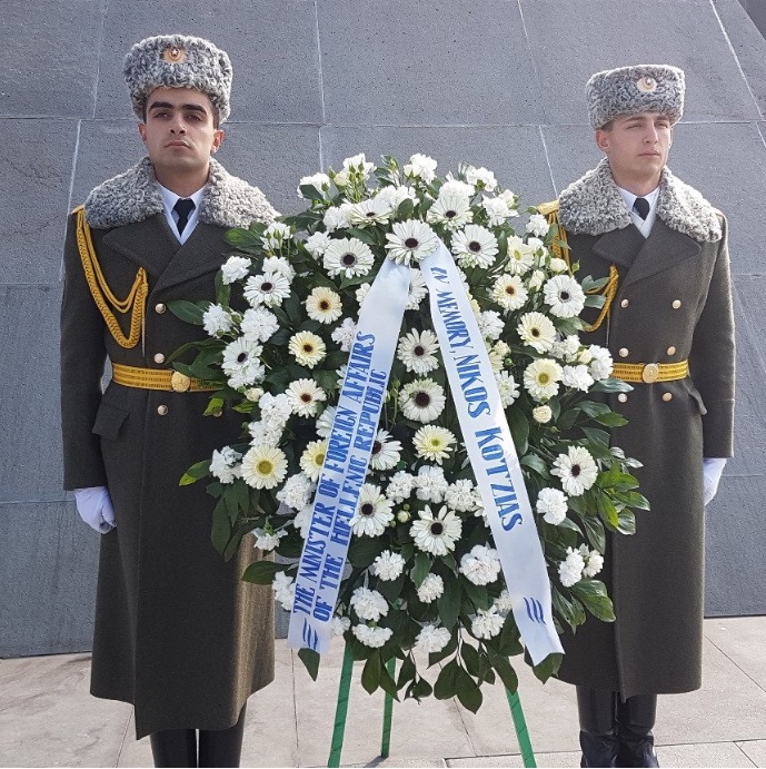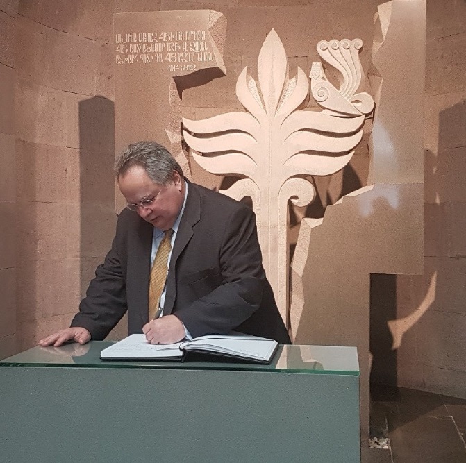 Ο Έλληνας υπουργός Εξωτερικών απέτισε φόρο τιμής στους νεκρούς της Γενοκτονίας των Αρμενίων, καταθέτοντας στεφάνι στο Μνημείο μνήμης στο Ερεβάν της Αρμενίας, όπου πραγματοποιεί επίσημη επίσκεψη.