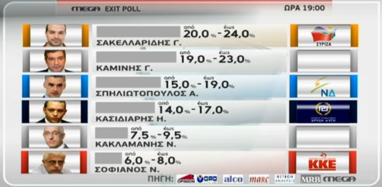 Προβάδισμα της Ρένας Δούρου και του Γαβριήλ Σακελλαρίδη για την Περιφέρεια Αττικής και τον Δήμο Αθηναίων αντίστοιχα, δείχνει το exit poll (δημοσκόπηση εξόδου) που μετέδωσαν οι τηλεοπτικοί σταθμοί στις 19:00, την ώρα που έκλεισαν οι κάλπες.