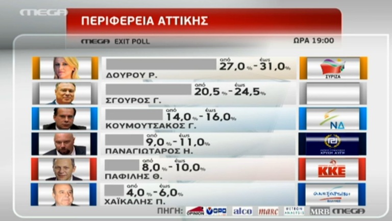Τα αποτελέσματα του exit poll για την περιφέρεια Αττικής, με βάση τα στοιχεία που είχαν συγκεντρωθεί, έχουν ως εξής: