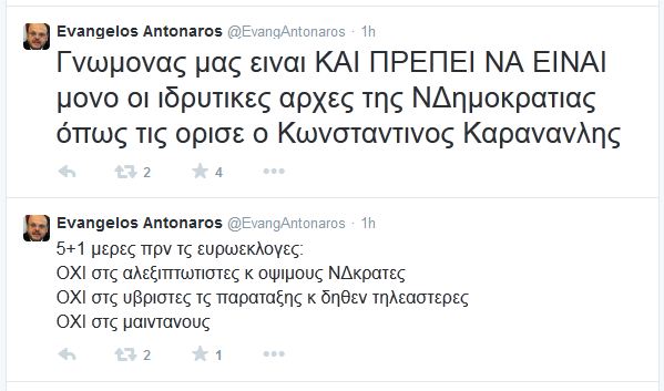 Το δικό του μήνυμα στέλνει ενόψει των ευρωεκλογών ο Ευάγγελος Αντώναρος μέσω του Twitter και υποδεικνύει ποιους δεν πρέπει να ψηφίσει ο κόσμος της Νέας Δημοκρατίας.