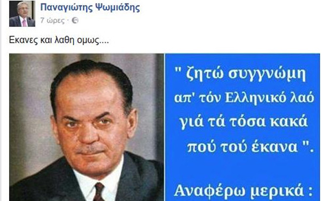 Ο Π. Ψωμιάδης ανήρτησε μια φωτογραφία στην οποία απεικονίζεται ο δικτάτορας Παπαδόπουλος. Δίπλα έχει ένα κείμενο στο οποίο ο πρωτεργάτης της Χούντας φέρεται να ζητά «συγγνώμη» με ειρωνικό τρόπο, απαριθμώντας μία σειρά «επιτευγμάτων» της δικτατορίας.