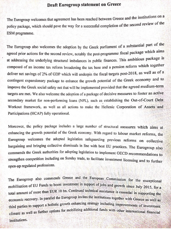 Δεσμεύσεις για δυσθεώρητα πλεονάσματα -3,5% του ΑΕΠ έως το 2022 και 2,2% από το 2023 έως το 20260- προέβλεπε το προσχέδιο της ανακοίνωσης του Eurogroup.