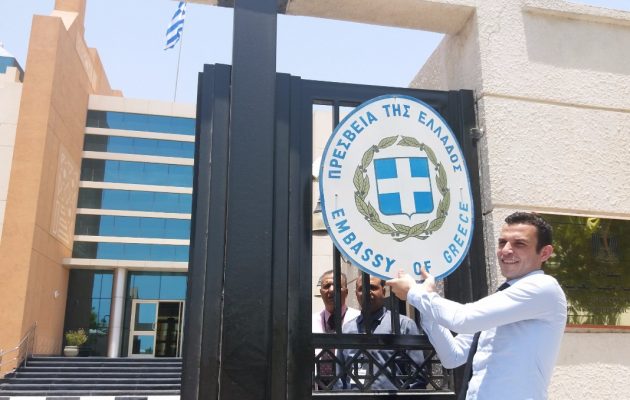 Είναι η στιγμή που η Ελληνική Σημαία έχει ήδη υψωθεί στο κτίριο της Αιγυπτιακής Πρεσβείας στη Ντόχα του Κατάρ και τοποθετείται και το ελληνικό εθνόσημο στην είσοδό της.