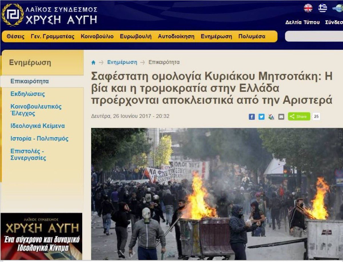Στην πρώτη σελίδα του ιστότοπου της Χρυσής Αυγής, φιλοξενελιται με αποθεωτικούς τίτλους, η χθεσινή δήλωση του προέδρου της ΝΔ, στην αμερικανική πολιτική ιστοσελίδα Politico, όπου κυριολεκτικά “ξεπλένει” τη ΧΑ και την ακροδεξιά.