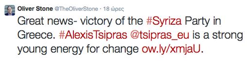 Όπως ήταν φυσιολογικό ο διάσημος σκηνοθέτης του Χόλιγουντ μόλις έμαθε τα αποτελέσματα των εκλογών πανηγύρισε και έγραψε στο twitter: “Σπουδαία είδηση – νίκησε ο ΣΥΡΙΖΑ στην Ελλάδα. Ο Τσίπρας είναι η νέα δύναμη για αλλαγή στην Ευρώπη”.