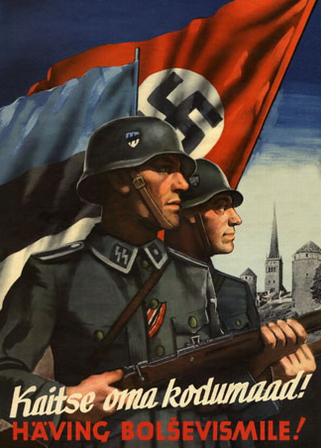 “Προστατέψτε την πατρίδα σας, θάνατος στον Μπολσεβικισμό” είναι το σύνθημα της αφίσας που καλούσε Εσθονούς να καταταγούν στον στρατό του Τρίτου Ράιχ. Όπως βλέπετε και στην αφίσα, η εσθονική σημαία κυματίζει μαζί με τη σβάστικα.