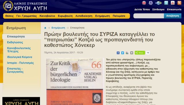 Στην ιστοσελίδα της ναζιστικής συμμορίας, έγραψαν: “Τον ρόλο του «πατριώτη» (όπως παρουσιάζεται από κάποια ψεκαστήρια…) Κοτζιά, ως προπαγανδιστή του σοβιετισμού, με… ειδίκευση στην εξύμνηση του καθεστώτος του Χόνεκερ και της Στάζι, κατήγγειλε με άρθρο του ο γνωστότατος αριστερός συγγραφέας και πρώην βουλευτής του ΣΥΡΙΖΑ, Περικλής Κοροβέσης”.