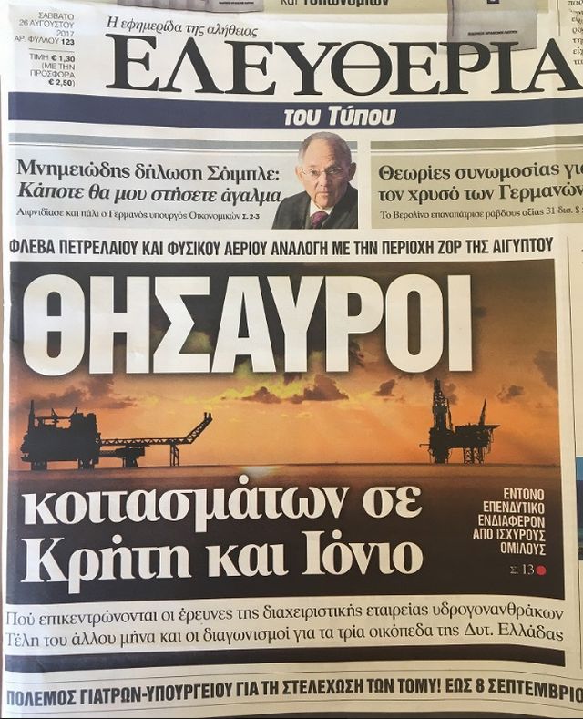 »Το πρωτοσέλιδο της «Ελευθερίας του Τύπου», που μιλά για θησαυρούς κοιτασμάτων στο Ιόνιο και νότια της Κρήτης, αποτυπώνει τις πραγματικές διαστάσεις μιας προσπάθειας που ξεκινήσαμε πριν από 6 χρόνια, αλλά έμεινε μετέωρη.