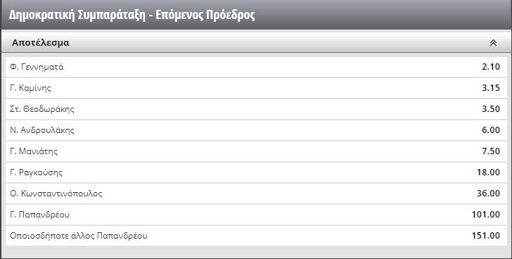 Στην παρακάτω εικόνα εμφανίζονται οι αποδόσεις της εταιρείας «Novibet», σύμφωνα με τις οποίες «φαβορί» στην κούρσα εμφανίζεται να είναι η Φώφη Γεννηματά.