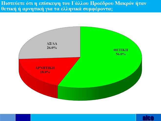 Ειδικότερα, το 56% θεωρεί ότι η επίσκεψη του Γάλλου Προέδρου Εμμανουέλ Μακρόν ήταν θετική για τα ελληνικά συμφέροντα, το 18% αρνητική και το 26% δεν ξέρει/δεν απαντά.