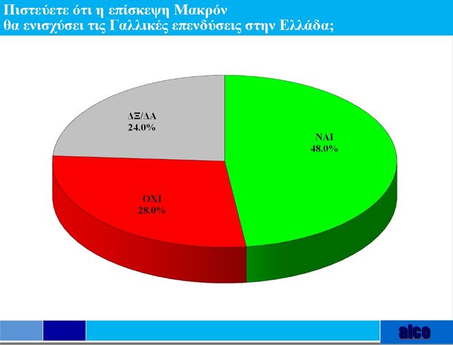 Στο ερώτημα “πιστεύετε ότι η επίσκεψη Μακρόν θα ενισχύσει τις γαλλικές επενδύσεις στην Ελλάδα, το 48% απαντά “ναι”, το 28% “όχι” και το 24% δεν ξέρει/δεν απαντά.