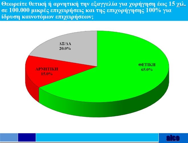 Το 65% θεωρεί θετική την εξαγγελία για χορήγηση έως 15.000 ευρώ σε 100.000 μικρές επιχειρήσεις και της επιχορήγησης 100% για ίδρυση καινοτόμων επιχειρήσεων. Το 15% θεωρεί αυτή την εξαγγελία αρνητική. Το 20% δεν ξέρει/ δεν απαντά.