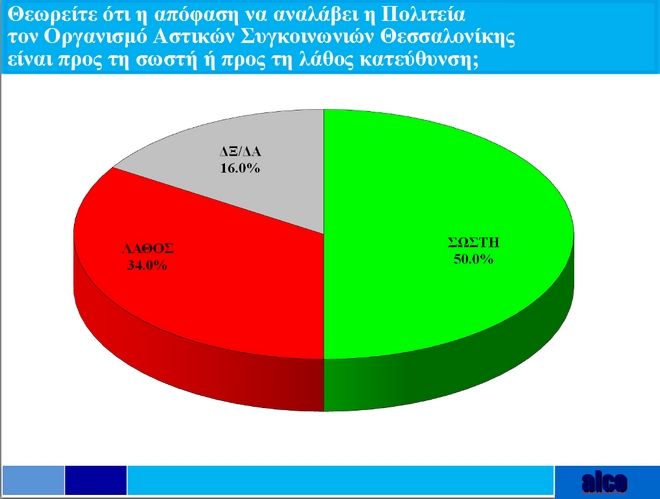 Ενδιαφέρον έχουν οι απαντήσεις των πολιτών και σε ένα θέμα, που είχε γίνει αντικείμενο πολιτικής αντιπαράθεσης. Ειδικότερα στο ερώτημα “θεωρείτε ότι η απόφαση να αναλάβει η πολιτεία τον Οργανισμό Αστικών Συγκοινωνιών Θεσσαλονίκης είναι προς τη σωστή ή προς τη λάθος κατεύθυνση;” το 50% απαντά προς τη σωστή κατεύθυνση, το 34% απαντά προς τη λάθος κατεύθυνση και το 16% δεν ξέρει/ δεν απαντά.