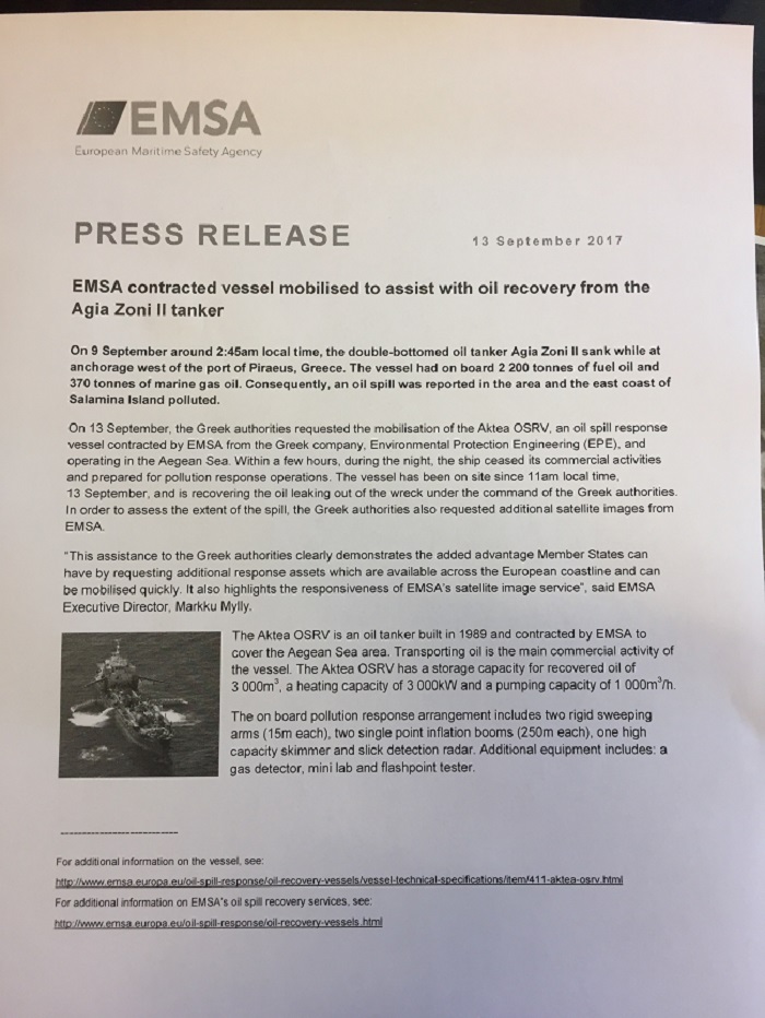 Η European Maritime Safety Agency διαψεύδει τον αρχηγό της αξιωματικής αντιπολίτευσης και επιβεβαιώνει τον υπουργό Ναυτιλίας ότι το πλοίο βρισκόταν σε εμπορική αποστολή όταν έγινε η βύθιση του ΑΓΙΑ ΖΩΝΗ.