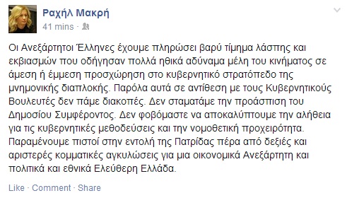 Η βουλευτής των Ανεξάρτητων Ελλήνων Ραχήλ Μακρή έγραψε χαρακτηριστικά: