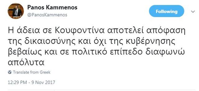 Τη διαφωνία του με την χορήγηση άδειας στον Δημήτρη Κουφοντίνα διατύπωσε ο Πάνος Καμμένος με δύο αναρτήσεις του στο Twitter σχεδόν ταυτόχρονα με τη στιγμή που ο καταδικασμένος για τρομοκρατία έβγαινε από τις φυλακές Κορυδαλλού.