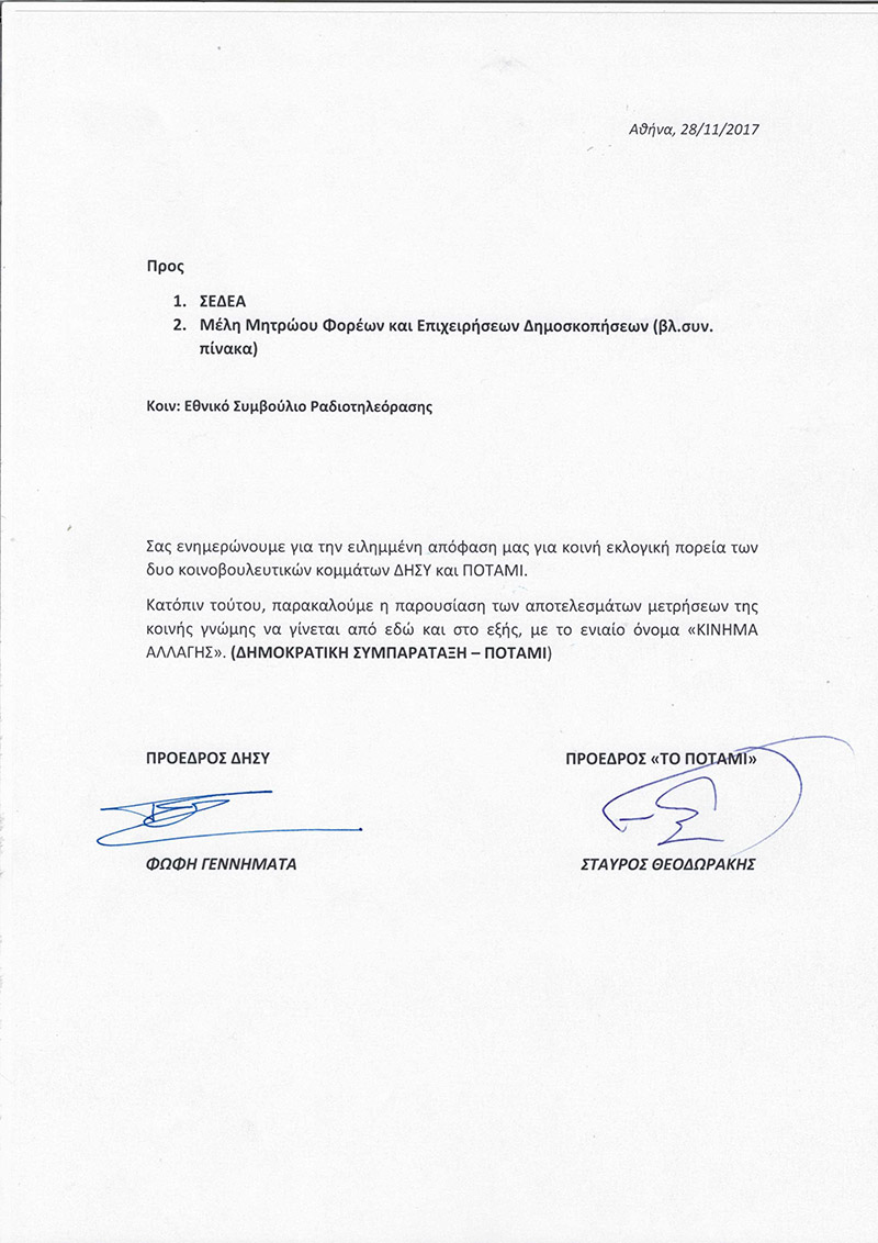 Το βράδυ της Τρίτης Φώφη Γεννηματά και Σταύρος Θεοδωράκης έστειλαν επιστολή προς τις εταιρείες δημοσκοπήσεων ζητώντας από εδώ και πέρα να μετρούν το Κίνημα Αλλαγής και όχι τη ΔΗΣΥ και το Ποτάμι.