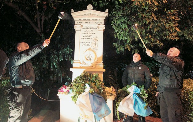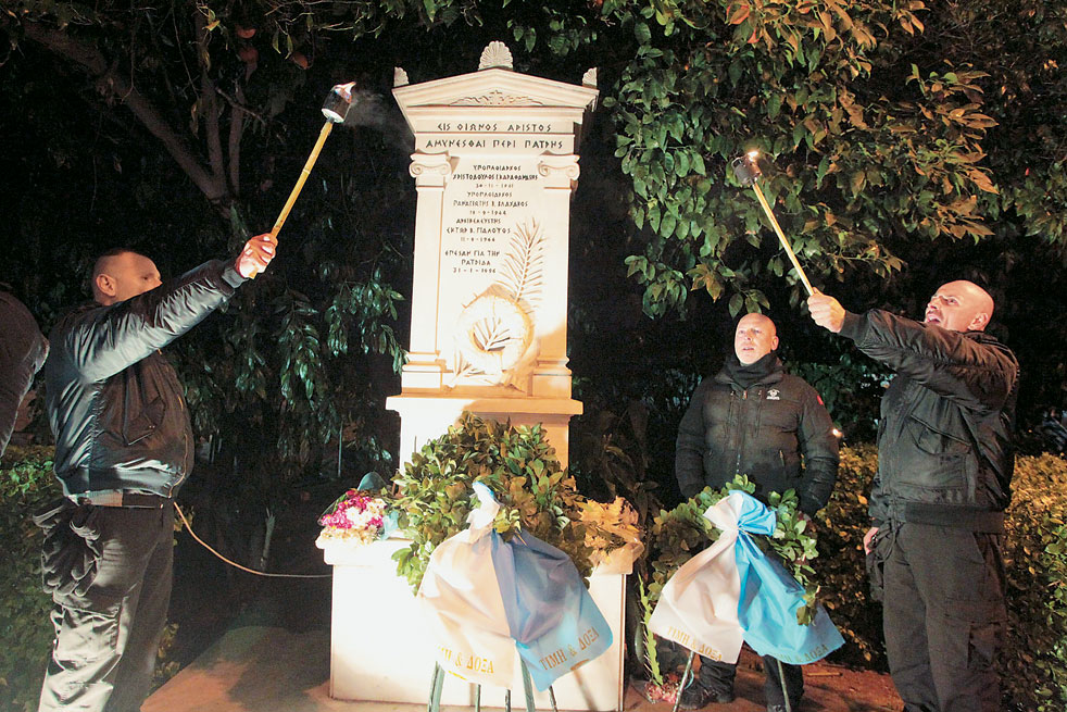 Ο Ματίας Φίσερ (αριστερά) και Ελληνες ομοϊδεάτες του με τους χαρακτηριστικούς αναμμένους πυρσούς κατά την κατάθεση στεφανιού στο Μνημείο Ιμίων στην πλατεία Ρηγίλλης. Ο αρχηγός του FNS ξεχωρίζει ως ηγετική φυσιογνωμία στον νεοναζιστικό χώρο της Γερμανίας και η παρουσία του στη συγκέντρωση επισκίασε τους υπόλοιπους συμπατριώτες του νεοναζί που βρέθηκαν στην Ελλάδα.