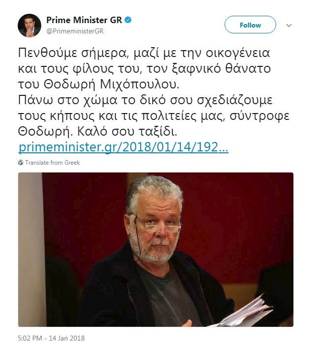 Τα παραπάνω έγραψε στο Twitter ο Αλέξης Τσίπρας για τον θάνατο του δημοσιογράφου Θοδωρή Μιχόπουλου, που υπήρξε και διευθυντής του Γραφείου Τύπου του Πρωθυπουργού.