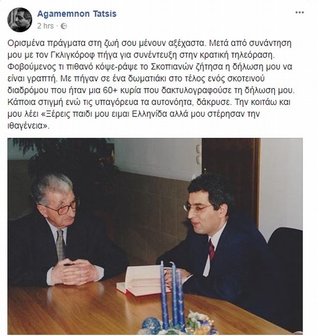 Μια συγκλονιστική κατάθεση έκανε στη σελίδα του στο Facebook ο γνωστός δικηγόρος και σοσιαλπατριώτης Αγαμέμνων Τάτσης. Δημοσιεύοντας μια φωτογραφία του με τον Κίρο Γκλιγκόροφ από τη δεκαετία του 1990, μοιράστηκε το εξής περιστατικό: