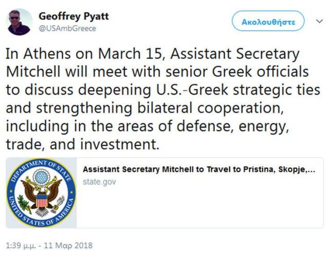 Σύμφωνα με την σχετική ενημέρωση από το υπουργείο Εξωτερικών των ΗΠΑ, που δημοσιοποίησε με tweet του ο πρέσβης των ΗΠΑ στην Αθήνα Τζέφρι Πάϊατ, ο Γουές Μίτσελ θα ταξιδεύσει σε Κόσοβο, πΓΔΜ, Σερβία, Ελλάδα και Κύπρο ξεκινώντας την περιοδεία του από την Πρίστινα στις 12 Μαρτίου.