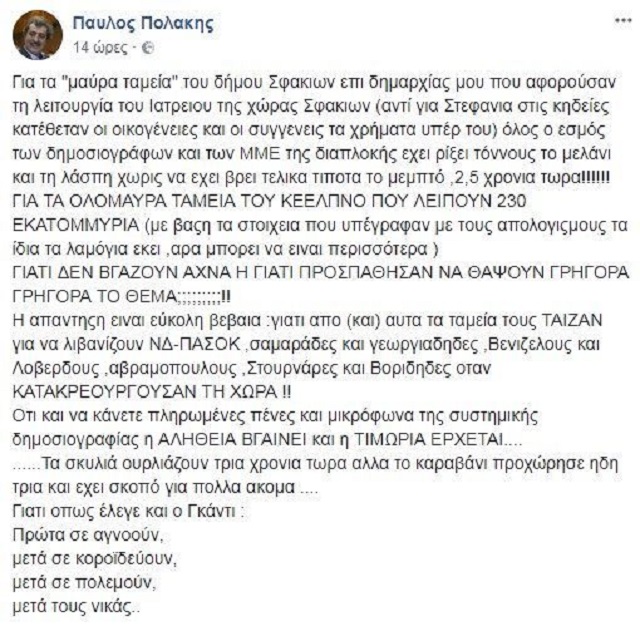 Για τα “μαύρα ταμεία” του δήμου Σφακίων επί δημαρχίας μου που αφορούσαν τη λειτουργία του Ιατρείου της χώρας Σφακίων (αντί για στεφάνια στις κηδείες κατέθεταν οι οικογένειες και οι συγγενείς τα χρήματα υπέρ του) όλος ο εσμός των δημοσιογράφων και των ΜΜΕ της διαπλοκής έχει ρίξει τόννους το μελάνι και τη λάσπη χωρίς να έχει βρει τελικά τίποτα το μεμπτό ,2,5 χρόνια τώρα!!!!!!
