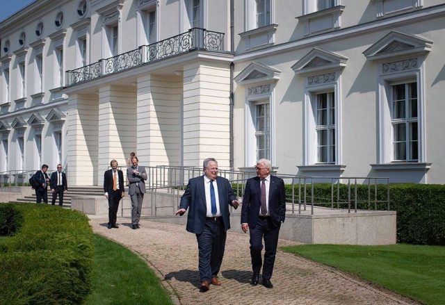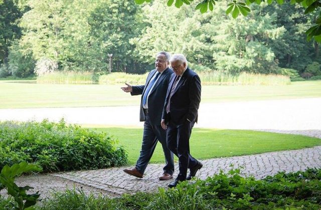 Φωτογραφίες που δόθηκαν στη δημοσιότητα από τη γερμανική Προεδρία δείχνουν Κοτζιά και Σταϊνμάγερ να συζητούν κάνοντας μια βόλτα στον κήπο του Προεδρικού Μεγάρου.